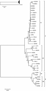 The complete coat protein nucleotide encoding sequences of 13 Mirafiori lettuce big-vein virus isolates from Australia were compared to those of 23 other isolates, including one from Australia. On phylogenetic analysis, sub-clade A1 contained isolates from Australia (13), Europe and Japan, A2 contained isolates from Australia (1), Europe and South America, and B1 and B2 contained only European isolates. In the amino acid sequences deduced, the N-terminus and central regions varied considerably between clades A and B. Mean Dn/Ds ratios were 0.112, 0.076, 0.187 and 0.063 for all isolates, Australian isolates, clade A isolates and clade B isolates, respectively.