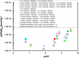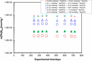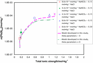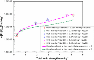 In this study, solubility measurements of lead carbonate, PbCO3(cr), cerussite, as a function of total ionic strengths are conducted in the mixtures of NaCl and NaHCO3 up to I = 1.2 mol kg−1 and in the mixtures of NaHCO3 and Na2CO3 up to I = 5.2 mol kg−1, at room temperature (22.5 ± 0.5 °C). The solubility constant (log K os ) for cerussite was determined as −13.76 ± 0.15 (2σ) with a set of Pitzer parameters describing the specific interactions of PbCO3(aq), \( {\text{Pb}}\left( {{\text{CO}}_{ 3} } \right)_{2}^{2 - } \), and Pb(CO3)Cl− with the bulk-supporting electrolytes, based on the Pitzer model. The model developed in this work can reproduce the experimental results including model-independent solubility values from the literature over a wide range of ionic strengths with satisfactory accuracy. The model is expected to find applications in numerous fields, including the accurate description of chemical behavior of lead in geological repositories, the modeling of formation of oxidized Pb–Zn ore deposits, and the environmental remediation of lead contamination.