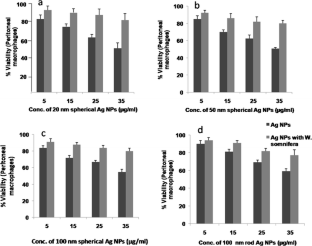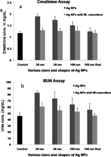 In the present study, toxicity of nanoparticles is evaluated for assessing their effect on liver and kidney. We have synthesized highly mono-disperse spherical and rod-shaped silver nanoparticles using reverse microemulsion and aqueous phase methods. These were characterized by UV–vis spectrophotometer, dynamic light scattering, and transmission electron microscope confirming the formation of different sizes of spherical-shaped and rod-shaped silver nanoparticles (Ag NPs). Acute toxicity of different shapes and sizes of Ag NPs and their modulations by using Withania somnifera were evaluated through biochemical and histopathological changes in liver and kidney tissues of Wistar rats. We also evaluated cytotoxicity in specific murin macrophages through confocal microscopy. Cytotoxicity analysis indicates that median lethal dose (LD50) for 20, 50, and 100-nm size spherical and 100-nm rod-shaped Ag NPs was 0.25, 0.35, 0.35, and 0.35 mg/ml, respectively. We also calculated clinically important protein concentration to illustrate the efficacy of Ag nanomaterials. These studies indicated that 20, 50, and 100-nm spherical Ag NPs (35 mg/kg, 23 days) increased the biochemically important enzymes and substrate levels glutamate oxaloacetate transaminase (GOT), glutamate pyruvate transaminase (GPT), alkaline phosphatase (ALP), creatinine, and urea concentration in serum, showing liver and kidney tissue damage. After 23 days of treatment of Ag NPs (20, 50, and 100 nm spherical), along with W. somnifera, toxicity of Ag NPs significantly decreased and marginalized. However, no significant changes were observed for 100-nm rod-shaped Ag NPs on normal liver and kidney architecture. Given their low toxic effects and high uptake efficiency, these have a promising potential as to lower the toxicity of Ag NPs.