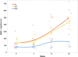 From baseline to 24 weeks post-fracture, the BMD changed from 105.5 (95% CI 98.6–113) to 428.0 (331–554) mgHA/ccm at the fracture site, from 111.0 (104–119) to 375.3 (290–486) mgHA/ccm at the inner callus area, and from 98.5 (91.6–106) to 171.6 (132–222) mgHA/ccm at the external callus area. The BMD increased at the fracture site and inner callus area, but increased only slightly at the external callus area. At 24 weeks post-fracture, the BMD at the fracture site and inner callus area was significantly higher than the external callus area.