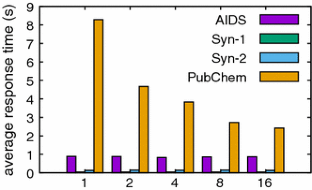 Effectiveness of structural trimming for \(\mathsf {mces}\) Fig. 37 reports the average speedups due to the trimming technique introduced in Sect. 4.3.2 on all datasets. There were at least three orders of magnitudes of speedup. We remark that there were some large queries that could not be finished without trimming; these queries are excluded. Recall that \(\mathsf {mces}\) was a performance bottleneck. With trimming techniques, we report in Fig. 38 that the costs of \(\mathsf {mces}\) were around 30% (respectively, 60%) of global ranking costs for the synthetic datasets (respectively, the real datasets).