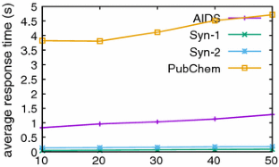From the last experiment, we found that the art of online processing was determined by either local or global rankings, which are in turn dependent to |q|. We illustrate further the relations between the two by reporting performance breakdown on all datasets datasets (see Figs. 31, 32, 33, 34). For Aids and PubChem, we observed that the runtimes of global ranking increased much faster than those of the local one, due to the costly online \(\mathsf {mces}\) computations. For Syn-1 and Syn-2, we observed the arts of the two phases exhibited linear trends.