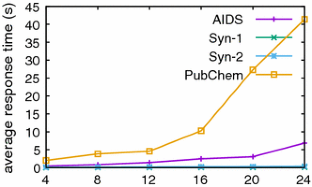 We compared the suggestion qualities of AutoG using the proposed \(c\)-prime features and \(c\)-prime features on top of discriminative features, simply denoted as gIndex. We report the suggestion qualities from simulations in Tables 18, 19 and 20. The results showed that such suggestions were still somewhat useful. As expected, when they are compared to the results from Tables 4, 5 and 6, the proposed \(c\)-prime features gave clearly higher quality suggestions than those by using discriminative features. More specifically, when we varied \(\delta \), the average values of 1 Hit (%), #AutoG, AutoG |E| and TPM (%) of our proposed \(c\)-prime features were 99%, 2.8, 3.6, and 48%. whereas those of gIndex were 46%, 0.5, 1.2, and 19%. When we varied |q|, those quality metrics of the proposed features were 99%, 3.2, 5.0, and 44%, whereas those of gIndex were 76%, 1.1, 3.0, and 27%. Similarly, when we varied k, those quality metrics of the proposed features were 93%, 1.9, 2.7, and 36%, whereas those of gIndex were 49%, 0.5, 1.4, and 21%. The reason is simple. The design goal of gIndex is to efficiently prune non-answer graphs of a query, not query autocompletion.