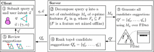 Feature pair composition enumeration Algorithm 4 requires further elaboration. It takes FDag and the maximum increment size as input, and outputs a set of feature pair compositions and some auxiliary data (i.e., \(f_{ij}\) in Line 5 and \(F_l\) in Line 12). We highlight some important steps before the details. (i) In Line 5, it shows that a query composition \((f_i, f_j, \mathsf {cs}, \lambda _i, \lambda _j)\) forms \(f_{ij}\), and \(f_{ij}\) itself can be a feature. We record it in \(\zeta \); we count the occurrences of \(f_{ij}\) in all \(\zeta \)s and obtain \(f_{ij}\)’s composability. (ii) While \(f_{ij}\) may not be a feature, it may contain some features other than \(f_i\) and \(f_j\). We record such features in \(F_l\). It is known that in feature-based query processing, the more features (\(F_q\)) the query has, the more accurate the candidate query answer set (\(D_q\)) is, because \(D_q\) = \(\cap _{f \in F_q}\) \(D_{f}\). (iii) The parameter \(\delta \) is the threshold on the size increment in a query suggestion. The number of candidate suggestions increases exponentially with \(\delta \). Therefore, to ensure an interactive response, we may set a modest \(\delta \) (e.g., its default is 5 in our experiments).