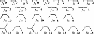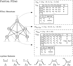 In this appendix, we present the construction algorithm of FDag (shown in Algorithm 3). The details of Algorithm 3 can be presented as follows. First, we sort F in ascending order of their edge numbers (Line 2). Then, we process the features one by one (Line 3). We create a node \(v_f\) in FDag, for each \(f \in F\), and compute the automorphism relation of f (\(A_f\)). For index nodes \(v_f\) and \(v_{f'}\), we perform a subgraph isomorphism test between f and \(f'\) (Line 9). If subgraph isomorphism relations exist, we add the edge (\(v_f\), \(v_{f'}\)) to FDag, and associate the subgraph embeddings to the edge (Lines 10–11). Finally, we generate \(\mathsf {anc}\) and \(\mathsf {des}\) from the FDag structure (Line 12). Next, Line 13 enumerates the possible compositions of a feature pair and determines intermediate results for computing structural difference between compositions (as presented in Algorithm 4).