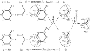 The details of Algorithm 4 can be described as follows. It starts the enumeration from a feature (\(\mathsf {cs}\)), and composes large query graphs from two descendants (\(f_i\) and \(f_j\)) of \(\mathsf {cs}\) (Lines 1–2). Line 3 checks if the increment is smaller than \(\delta \). In Line 4, we iterate through each embedding of \(\mathsf {cs}\) in \(f_i\) and \(f_j\), respectively. In Line 5, we compose a larger graph (denoted as \(f_{ij}\)) from \(f_i\) and \(f_j\) via \(\mathsf {cs}\). If \(f_{ij}\) is a feature, then Algorithm 4 just detected a possible way to compose \(f_{ij}\). In Lines 6–7, we employ the techniques in Sect. 4.2 to prune the empty queries.
