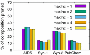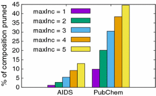 In a nutshell, we counted the composability of the discriminative features and index those that are \(c\)-prime. We used the implementation from iGraph [16]. We adopted the default parameter values for gIndex. In particular, the support threshold was set to 10%, the maximum feature size maxL was 10, and the discriminative ratio \(\gamma _{min}\) was 2. We implemented the same size-increasing function as in [42]. Under this setting, we obtained 2370 discriminative features from the PubChem dataset. We then constructed the FDag index as before.
