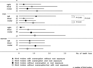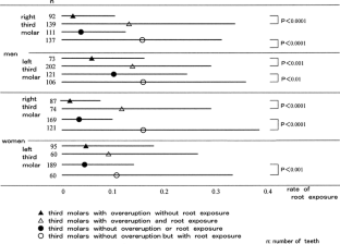 Bone formation is seen around the third molar even when the tooth is exposed to the oral environment due to overeruption. To determine if overeruption of the third molar with or without root exposure is related to the status of the exposure of other teeth in the mandible, using orthopantomographs, 424 third molars were studied in 371 patients who were over 41 years of age. The rate of overeruption and root exposure in third molars was measured, and its relationship to the number of teeth lost and the rate of root exposure in other teeth in the mandible was analyzed. Tooth loss in the group of third molars with overeruption without root exposure was greater than in that without overeruption or root exposure in men, whereas the relationship was not seen in women. We found that root exposures of other teeth in the group of third molars with overeruption without root exposure were significantly smaller than in those with root exposure in both genders. Third molars with overeruption without root exposure, in which bone formation was easy to observe for radiographic diagnosis, were correlated with periodontal health in the mandible, suggesting a component of precision determination for predicting resistance to periodontitis.