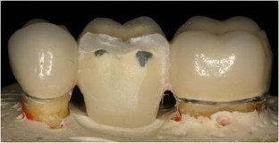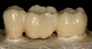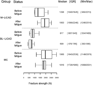 The authors divided 96 human premolars and molars into three equal groups. Lithium–disilicate ceramic (IPS-e.max-CAD) was milled with the CEREC-3-system in full-anatomic FDP dimensions (monolithic: M-LiCAD) or as framework (Bi-layer: BL-LiCAD) with subsequent hand-layer veneering. Metal–ceramic FDPs (MC) served as control. Single-load-to-failure tests were performed before and after mouth-motion fatigue.
