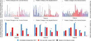 We retrospectively reviewed 43 patients who underwent conventional FFF condylar reconstruction, and 5 patients who underwent reconstruction by computer-assisted three-dimensional (3D) printing methods. Three-dimensional models were built from cone-beam computed tomography images obtained immediately postoperatively and 1-year postoperatively. The glenoid fossa and fibular condyle centers were used to measure the fibular condyle position in the models. Clinical examination indices, including maximum mouth opening (MMO), pain during chewing/mouth opening, and patient satisfaction with mastication and 1-year outcomes were assessed.