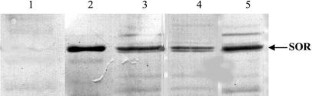 The sulfur oxygenase/reductase (SOR) of Acidianus strain S5 was purified and characterized after expressing the SOR gene in a recombinant strain of Escherichia coli. The N-terminal sequence of the purified SOR protein was the same as the deduced amino acid sequence from previously cloned SOR genes. Enzymatic studies indicated that the SOR catalyzed the conversion of elemental sulfur (So) to sulfite, thiosulfate, and sulfide. The optimal pH and temperature were 5.0 and 70 °C, respectively. Comparison of this SOR and that of A. ambivalens revealed several differences between these two SORs. The most striking difference is that the SOR of Acidianus S5 had maximal activity at acidic pH. By application of anti-SOR serum and the Western blot technique, it was found that SOR proteins existed in A. brierleyi and in Acidianus S5 cells cultivated with thiosulfate as the sole energy source, indicating that SOR may also play a role in thiosulfate metabolism.