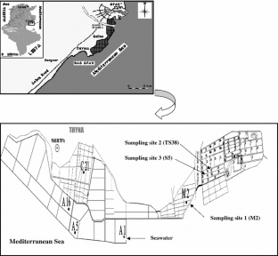 16S rRNA gene clone libraries were separately constructed from three ponds with different salt concentrations, M2 (15%), TS38 (25%) and S5 (32%), located within a multipond solar saltern of Sfax. The 16S rRNA genes from 216 bacterial clones and 156 archaeal clones were sequenced and phylogenetically analyzed. 44 operational taxonomic units (OTUs) were generated for Bacteria and 67 for Archaea. Phylogenetic groups within the bacterial domain were restricted to Bacteroidetes and Proteobacteria, with the exception that one cyanobacterial OTU was found in the TS38 pond. 85.7, 26.6 and 25.0% of the bacterial OTUs from M2, TS38 and S5 ponds, respectively, are novel. All archaeal 16S rRNA gene sequences were exclusively affiliated with Euryarchaeota. 75.0, 60.0 and 66.7% of the OTUs from, respectively, M2, TS38 and S5 ponds are novel. The result showed that the Tunisian multipond solar saltern harbored novel prokaryotic diversity that has never been reported before for solar salterns. In addition, diversity measurement indicated a decrease of bacterial diversity and an increase of archaeal diversity with rising salinity gradient, which was in agreement with the previous observation for thalassohaline systems. Comparative analysis showed that prokaryotic diversity of Tunisian saltern was higher than that of other salterns previously studied.