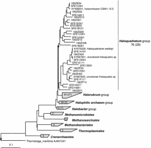 Burns DG, Janssen PH, Itoh T, Kamekura M, Li Z, Jensen G, Rodríguez-Valera F, Bolhuis H., Dyall-Smith MD (2007) Haloquadratum walsbyi gen. nov., sp. nov., the square haloarchaeon of Walsby, isolated from saltern crystallizers in Australia and Spain. Int J Syst Evol Microbiol 57:387–392