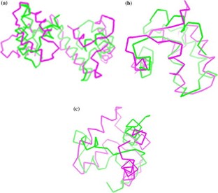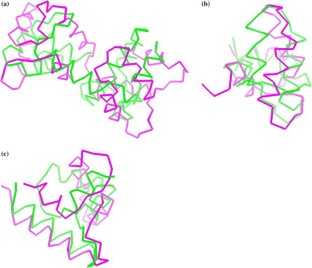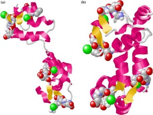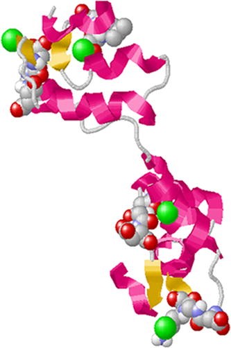 Figure The predicted 3D Structure of EhCaBP with bound Ca2+ ions (CaBP-0). In the structure, α-helices are shown in pink and the β-strands in yellow. Ca2+ ions are depicted as fluorescent green balls. Some of the residues in the calcium-binding loops are depicted in space-fill representation.