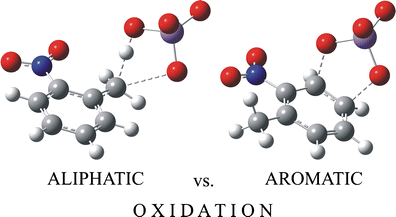 Table 5 Activation Gibbs free energies, exothermicity, contribution of alternative pathways and comparison of methyl group vs. ring oxidation with experimental data in oxidation reactions of 2-nitrotoluene and 2,6-dinitrotoluene by permanganate anion