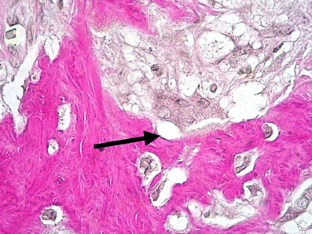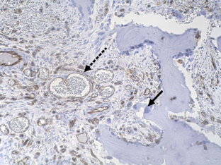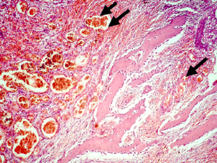 The histological examination revealed a mesenchymal tumor with numerous capillaries and dilated vessels immunohistochemically being positive for CD31, but not for D2-40. In addition, there was a remarkable increase of osteoclasts that sometimes exhibited Howship’s lacunae. The tumor was diagnosed as intraosseous hemangioma with prominent bone degradation.