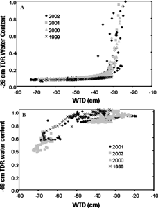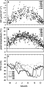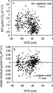 Ecosystem respiration (ER) is an important but poorly understood part of the carbon (C) budget of peatlands and is controlled primarily by the thermal and hydrologic regimes. To establish the relative importance of these two controls for a large ombrotrophic bog near Ottawa, Canada, we analyzed ER from measurements of nighttime net ecosystem exchange of carbon dioxide (CO2) determined by eddy covariance technique. Measurements were made from May to October over five years, 1998 to 2002. Ecosystem respiration ranged from less than 1 μmol CO2 m−2 s−1 in spring (May) and fall (late October) to 2–4 μmol CO2 m−2 s−1 during mid-summer (July-August). As anticipated, there was a strong relationship between ER and peat temperatures (r2 = 0.62). Q10 between 5° to 15°C varied from 2.2 to 4.2 depending upon the choice of depth where temperature was measured and location within a hummock or hollow. There was only a weak relationship between ER and water-table depth (r2 = 0.11). A laboratory incubation of peat cores at different moisture contents showed that CO2 production was reduced by drying in the surface samples, but there was little decrease in production due to drying from below a depth of 30 cm. We postulate that the weak correlation between ER and water table position in this peatland is primarily a function of the bog being relatively dry, with water table varying between 30 and 75 cm below the hummock tops. The dryness gives rise to a complex ER response to water table involving i) compensations between production of CO2 in the upper and lower peat profile as the water table falls and ii) the importance of autotrophic respiration, which is relatively independent of water-table position.