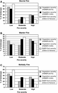We comment on a recent Ecosystem paper by Odion and Hanson (Ecosystems 9:1177–1189, 2006), in which the authors claim that high severity fire is rare in the Sierra Nevada under current conditions. Odion and Hanson’s results are predicated on BAER soil burn severity maps, which are based primarily on fire effects to soil, not vegetation. Odion and Hanson, and we fear others as well, are misinformed as to the nature of the BAER severity mapping process, and proper applications of BAER soil burn severity maps. By comparing the BAER soil burn severity maps to a true vegetation burn severity measure (RdNBR) calibrated by field data, we show that the area in the high soil burn severity class for the three fires analyzed by Odion and Hanson is substantially less than the area of stand-replacing fire, and that BAER maps—especially hand-derived maps such as those from two of the three fires—also greatly underestimate the heterogeneity in vegetation burn severity on burned landscapes. We also show that, contrary to Odion and Hanson’s claims, Fire Return Interval Departure (FRID) is strongly correlated with fire severity in conifer stands within the perimeter of the McNally Fire.
