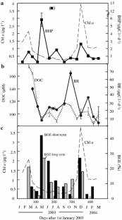 Fernandez M, Bianchi M, Van Wambeke F. 1994. Bacterial biomass, heterotrophic production and utilization of dissolved organic matter photosynthetically produced in the Almeria-Oran front. J Mar Syst 5:313–25.