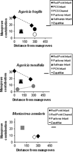 Coastal mangrove forests were historically considered as a source of organic matter (OM) for adjacent marine systems due to high net primary production; yet recent research suggesting little uptake through the food web because of low nutritional quality, challenges the concept of trophic linkage between mangrove forests and coral reefs. To examine the importance of mangrove forests to coral reef nutrient availability, we examined sessile reef-forming invertebrate consumers including hard corals, sponges, a bivalve mollusc, polychaete annelid and tunicate, and potential sources of OM (decaying mangrove leaves, microalgae, macroalgae, and seagrass) in Bocas del Toro, Panama. Using stable isotope analyses of δ34S and δ13C and a concentration-dependent version of the IsoSource mixing model, we were able to discriminate among and determine the range of potential contributions of our four OM sources to consumers. Contributions of microalgae and macroalgae were often indeterminate due to high variability, yet seagrass and mangrove contributions were often substantial. Mangrove OM ranged across sites and species of filter feeders from 0 to 57%, 7 to 41%, and 18 to 52% for sponges, file clams, and feather duster worms, respectively. Mangrove contribution to corals (Acropora cervicornis, Agaricia fragilis, Agaricia tenuifolia, Montastrea annularis, Diploria sp.) ranged from 0 to 44%. To examine whether OM contribution varied with distance from mangroves, we conducted a sponge transplant experiment that demonstrated declining mangrove contribution across three sponge species with increasing distance from the shore. These results supported the hypothesis of mangrove-coral reef nutrient linkages, providing the first evidence that mangrove inputs of OM to sessile invertebrates are substantial, accounting for 0–57% of the composition.