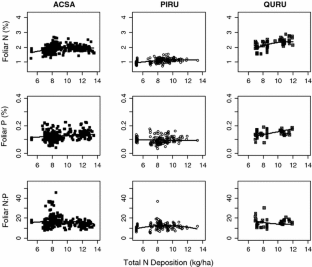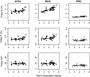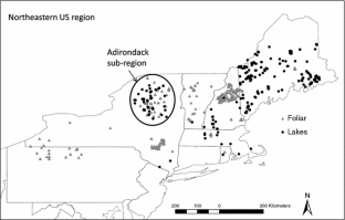 We would particularly like to acknowledge everyone who has generously contributed data to the NERC regional foliar and lake chemistry database, on which this study depended. As well as many of the co-authors, additional data contributors include Scott Bailey, Jana Compton, Tim Fahey, Steve Horsley, Bob Long, Mary Martin, Knute Nadelhoffer, Jen Pontius, Don Ross, Tom Siccama, Marie-Louise Smith, and many other NERC contributors. We would like to thank reviewers for thoughtful comments that have improved the manuscript, in particular encouraging us to include a landscape perspective linking aquatic and terrestrial systems. We would also like to thank funding sources, the US National Science Foundation Research Coordination Networks program (DEB-0342198), the W.M. Keck Foundation, the New York State Energy Research and Development Authority, the US Environmental Protection Agency, and the US Department of Agriculture Northeastern States Research Cooperative.