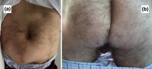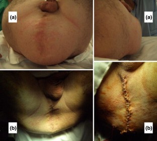 Symptomatic perineal herniation after abdominoperineal resection is a rare complication and its management remains challenging. Perineal laparoscopic mesh repair is safe and effective and can be performed with minimal complications. We report a giant perineal hernia treated by a combined laparoscopic mesh repair approach and plastic resection of the cutaneous perineal wound. To the best of our knowledge, this is the first report with this technical approach that we could find in the English literature.