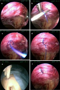 Patients with symptomatic epigastric hernias that were deemed to be too far superior to be repaired with an open technique through an umbilical incision were selected for SIPES repair. Two trocars (5 and 3 mm) were introduced through a single umbilical incision and the hernia repair was performed using looped 4-0 polypropylene sutures introduced through a 17-gage spinal needle in a lasso technique.