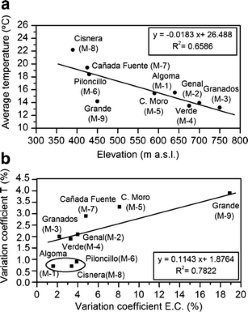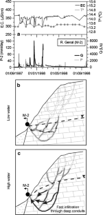 Dans les massifs carbonates, les écoulements sont conditionnés par les processus de karstification qui ont permis le développement de réseaux de conduits karstiques au sein de blocs micro fractures de faible perméabilité. Le massif karstique de la Sierra de las Nieves (Sud de l’Espagne) est soumis à un climat donné dans un contexte géologique déterminé ; il est ainsi possible d’analyser la variabilité spatiale et temporelle de la température de l’eau et de la conductivité électrique au niveau des principaux exutoires, donnant des réponses différentes aux épisodes pluvieux. Dans le cadre de ce site expérimental, des écoulements de type conduit et de type drainage diffuse ont été mise en évidence à partir d’une analyse combine de la température de l’eau et de la conductivité électrique. Les deux paramètres indiquent une grande variabilité dans les eaux provenant des systèmes de conduits et de faibles variations pour les eaux des sources drainant des systèmes de drainage diffus. Cependant, la température de l’eau souterraine montre de faibles variations, ce qui semble indiquer que ce paramètre est moins sensible à la caractérisation du degré de karstification, une question clef de la caractérisation du fonctionnement d’un aquifère.
