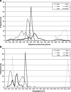 In carbonate massifs, flow patterns are conditioned by karstification processes which develop a conduit network and preserve low permeability microfractured blocks. The Sierra de las Nieves karst massif (southern Spain) is subjected to a given climatic and geological context, and thus it is possible to analyse the spatial and temporal variability of the water temperature and electrical conductivity at its main karst outlets, which display different responses to rainfall episodes. In this experimental field area, conduit flow and diffuse flow drainage patterns have been distinguished by combining groundwater temperature and electrical conductivity data. Both parameters show large variations in water coming from conduit flow systems and low variations in water drained by springs draining diffuse flow systems. However, groundwater temperature displays the smallest variations, which seems to indicate that this parameter is less sensitive as regards characterising the degree of karstification, which is a key question in characterising the aquifer functioning.