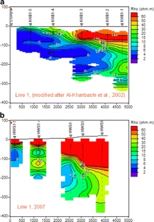 La intrusión de agua de mar y sus ritmos de propagación son problemas desafiantes en acuíferos costeros sobre bombeados de las zonas áridas como la región de Batinah en Oman. El estudio delinea la pluma salina, identifica la zona de agua dulce/agua salada, y estima el ritmo de migración de la pluma en el área Al Khabourah de la costa de Batinah. Los relevamientos electromagnéticos en el dominio de tiempo, ayudados por relevamientos de sondeos eléctricos verticales, y métodos de refracción sísmica han definido la posición de la interfase agua dulce/agua salada en el área. La actual posición de la interfase (2007), cuando se la compara con la determinada durante 2002, indica una recesión notable en la pluma salina y sugiere un ritmo de recesión media anual de 120 m. Esta recesión puede ser atribuida principalmente al dique de recarga de Wadi Al Hawasinah, construido en 1995, y a la promulgación de la nueva legislación sobre recursos hídricos. Este estudio revela el rol de protección del dique de recarga para contrarrestar al avance de la intrusión salina.