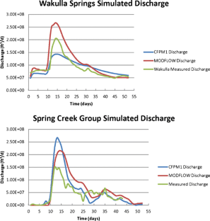 Groundwater flow in a well-developed karst aquifer dominantly occurs through bedding planes, fractures, conduits, and caves created by and/or enlarged by dissolution. Conventional groundwater modeling methods assume that groundwater flow is described by Darcian principles where primary porosity (i.e. matrix porosity) and laminar flow are dominant. However, in well-developed karst aquifers, the assumption of Darcian flow can be questionable. While Darcian flow generally occurs in the matrix portion of the karst aquifer, flow through conduits can be non-laminar where the relation between specific discharge and hydraulic gradient is non-linear. MODFLOW-CFP is a relatively new modeling program that accounts for non-laminar and laminar flow in pipes, like karst caves, within an aquifer. In this study, results from MODFLOW-CFP are compared to those from MODFLOW-2000/2005, a numerical code based on Darcy’s law, to evaluate the accuracy that CFP can achieve when modeling flows in karst aquifers at laboratory and sub-regional (Woodville Karst Plain, Florida, USA) scales. In comparison with laboratory experiments, simulation results by MODFLOW-CFP are more accurate than MODFLOW 2005. At the sub-regional scale, MODFLOW-CFP was more accurate than MODFLOW-2000 for simulating field measurements of peak flow at one spring and total discharges at two springs for an observed storm event.