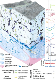 岩溶泉自然反应分析提供了其含水层的行为信息。(西班牙南部)Villanueva del Rosario泉自然反应的详细监测及定量和定性分析、水中的环境(总有机碳(TOC)、 NO3 −、 Cl− 及内荧光)及人工(荧光染料)示踪剂显示存在着通过含水层的快速流动管道水流系统及很短的过渡时间。这与荧光素钠和曙红突破曲线一致,也与用这些数据做的简单数值模型一致。然而,由于自然调节能力很低,并不是所有的补给影响同时传到泉水;考虑到单一的输入项,系统调整和传输水文动力变化的速度比化学组分和水温变化要快。另外,天然和人工示踪剂最大含量之间的时滞显示,全球系统反应(包括弥散渗入)比集中在地表一个点(落水洞)产生的渗入更快、更敏感。