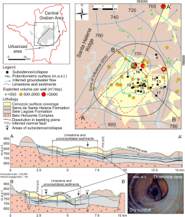 Un aumento en el consumo de agua subterránea en la municipalidad de Sete Lagoas (Minas Gerais, Brasil) ha inducido a la subsidencia y el colapso en las últimas tres décadas. El área está asociada con condiciones kársticas naturales. El objetivo principal de esta investigación fue evaluar e identificar las posibles zonas de riesgo de subsidencia ó de colapso. Se utilizaron fotografías aéreas, perfiles litológicos de pozos, perfilajes ópticos de pozos, y mapeos geológicos para categorizar los factores de riesgos influyentes en la subsidencia y colapso kárstico, los cuales fueron luego aplicados a un sistema de índices. El estudio mostró que la mayoría de las áreas urbanizadas recubren el manto de calizas de la Formación Sete Lagoas cubierto por sedimentos no consolidados, contenidos dentro de un graben, lo que resulta en límites de barreras para el flujo de agua subterránea. Esta estructura, junto con los procesos kársticos naturales, explican la ubicación de conductos de planos de estratificación agrandados por disolución y la alta conductividad hidráulica en la caliza. Se identificaron cinco zonas de riesgo en la municipalidad (riesgos insignificante, bajo, moderado, considerable y alto) relacionado a factores de riesgo geológico e hidrológico. El área urbanizada se ubica en gran parte en zonas de alto riesgo donde se localiza la mayoría de los rasgos de colapsos. La extracción de agua subterránea intensiva adicional en esa área probablemente generará eventos adicionales.