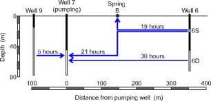 2000年5月一场暴雨之后致病菌造成的(加拿大安大略省)沃克顿地区古生代碳酸盐岩含水层的污染致使2300人患病,7 人死亡。后来的示踪实验显示,含水层地下水流非常快,含水层的水和地表水交换也非常迅速。三天的抽水实验期间电导率显示,大部分水流通过间隔为10米的层理面断裂,主要断裂水流中的电导率有和大差别,并随着时间的过去变化迅速。总大肠杆菌采样揭示,存在着瞬态地下水污染,特别是在暴雨之后,并可持续几天。依据含水层的双重介质性质,可以了解这些特征。大部分储存的水在基质里,但被认为是短时间内是静止的。几乎所有的传输通过断裂网络,由于水力扩散系数很高,断裂网络中地下水流速度很快(∼ 100 m/day),压力脉冲传播也很快。通过薄的和/或者断裂的表层以及在地表洪水期间抽水导致水流反转的泉点可出现快速补给。这些特征促进了源自地表的细菌进入含水层,及含水层内快速运移到抽水井。碳酸盐岩含水层中存在细菌很常见,这可以通过这些双重介质含水层中联通良好、大孔断裂网络得到解释,尽管许多含水层,诸如沃克顿地区的含水层,缺乏岩溶地貌。