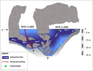 报道了双峰突破曲线(BTC)的存在,这是通过地下湖运输染料示踪剂的结果。对比利时南部的Furfooz岩溶系统进行了调查。在这个系统中,River Lesse部分地陷入了一个燕窝。水沿着一条通向直接连接到第二个地下湖泊的地下湖的独立导管。在第二湖下游的复水中检测到双峰BTC。本文首先描述了现场数据(各种水文条件下的示踪剂测试),其指向与峰值起源于湖泊内的非线性过程相关联的双峰。湖中的互补调查显示了染料示踪剂与导致溶质羽流分离的特定流体动力特征相关的复杂行为。提出了湖泊内溶质运输的概念模型。该模型强调了湖泊对染料流通过程的物理效应。