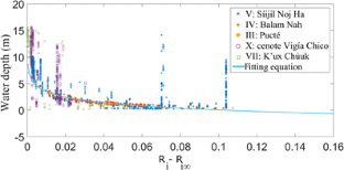 Figure 11 depicts UAV-borne water depth observations retrieved in Laguna Balam Nah, Pucté, cenote K’ux Chúuk, and cenote Vigía Chico.