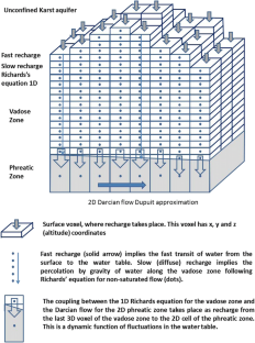 Um modelo matemático de um aquífero cárstico em funcionamento altamente heterogêneo é descrito. O aquífero está em um maciço cárstico de alto relevo e, como é comum nesses locais, os dados são escassos e não há dados de furos, piezômetros ou testes de bombeamento. A escassez de dados neste caso exigiu uma abordagem parcimoniosa para garantir que o nível de complexidade do modelo fosse proporcional à quantidade, tipo e qualidade dos dados disponíveis. A parcimônia também exige que o modelo inclua os componentes essenciais mínimos que adequadamente dão conta dos dados, que neste e em casos similares são as dualidades funcionais do sistema cárstico: dualidade na recarga, fluxo e descarga. O modelo é tridimensional (3D) no sentido em que o aquífero é discretizado em voxels 3D, embora o fluxo seja unidimensional (1D) e vertical na zona vadosa, e horizontal e bidimensional (2D) na zona saturada. O modelo parcimonioso foi projetado acoplando um fluxo 1D não saturado por gravidade ao longo da vertical (ao longo de cada coluna de voxels que discretiza o aquífero) e um fluxo Darcy 2D não confinado na zona saturada. No contexto deste tipo de aquífero, a recarga preferencial através da rede de condutos cársticos implica num aumento rápido do nível freático, cuja localização e extensão são parâmetros do modelo. As nascentes cársticas são simuladas por drenos. A metodologia, que é completamente geral, é ilustrada pela aplicação ao aquífero cárstico nas montanhas de Sierra de las Nieves, no sul da Espanha.