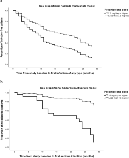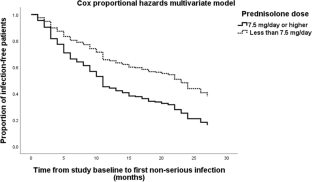 We included 259 patients during a mean follow-up of 23.3 ± 5.7 months. The incidence rate of infection of any type was 59.3 cases per 100 patient-years. Multivariate Cox models showed that (a) prednisolone ≥ 7.5 mg/day (HR = 1.95, 95%CI 1.26–3.03) and female gender (HR = 2.08, 95%CI 1.12–3.86) were associated with higher risk of infection of any type; (b) prednisolone ≥ 10 mg/day was associated with higher (HR = 4.32, 95%CI 1.39–13.40), and antimalarials with lower risk (HR = 0.18, 95%CI 0.06–0.51) of serious infection; (c) female gender (HR = 1.92, 95%CI 1.04–3.57) and prednisolone ≥ 7.5 mg/day (HR = 1.89, 95%CI 1.21–2.96) were associated with higher risk of non-serious infection; (d) antimalarials were associated with lower (HR = 0.49, 95%CI 0.26–0.93) and female gender (HR = 5.12; 95%CI 1.62–16.18) with higher risk of bacterial infection.