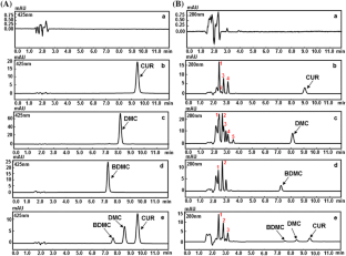 Jadhav BK, Mahadik KR, Paradkar AR. Development and validation of improved reversed phase-hplc method for simultaneous determination of curcumin, demethoxycurcumin and bis-demethoxycurcumin. Chromatographia 65: 483–488 (2007)