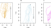 To understand how direct an ant’s path was, we used three indices of straightness: path straightness, sinuosity, and \({E}_{max}^{a}\), each of which relates to the directness of navigation towards a destination. Straightness is computed as the ratio of the straight-line distance between the release point at the displacement site and the final point in the frame before the ant moved out of the recording area to the overall length of the path. (Batschelet 1981; Deeti et al. 2023b, 2024b, c; Islam et al. 2021, 2023). Straightness ranges from 0 to 1, with larger values indicating straighter paths, while smaller values indicate more curved or convoluted paths. Sinuosity is an estimate of the tortuosity in a path, calculated as \(S=2{\left[p\left(\frac{1+c}{1-c}+{b}^{2}\right)\right]}^{-0.5}\), where p is the mean step length, c is the mean cosine of turning angles and \(b\) is the coefficient of variation of the step length. A trajectory step is the movement between the positions of the animal (thorax positions) recorded at consecutive video frames. Accordingly, step lengths are the Euclidean distances between consecutive points along a path, and turning angle refers to the change in direction between two consecutive steps. Sinuosity varies between 0 (straight) and 1 (extremely curved) (Benhamou 2004). The maximum expected displacement of a path, \({E}_{max}^{a}=\frac{{\beta }}{1-{\beta }}\), where \({\upbeta }\) is the mean cosine of turning angles, is a dimensionless value expressed as a function of number of steps, and is consistent with the intuitive meaning of straightness (Cheung et al. 2007). Larger maximum expected displacement values indicate straighter paths, hence greater displacement, while a smaller value suggests more localized or constrained movement. Paths were characterized and visualized in R (version 4.2.1; R Core Team, 2020) using the packages trajr (McLean and Skowron Volponi 2018) and Durga (Khan and McLean 2023). Statistical analyses were conducted using R (version 4.3.1). During learning walks, ants frequently displayed a series of stereotypical successive fixations in different head directions by rotating on the spot at one location, known as a “scanning bout” and we extracted the number of scanning bouts from each learning walk (Deeti et al. 2023c; Lionetti et al. 2023).
