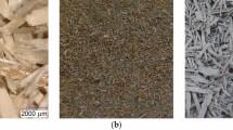 The boards were manufactured from particles produced from wood waste for core layers of particleboard (Japan Novopan Industrial Co., Ltd.). The average length of the particles was 15.4 (6.69) mm. The number in parentheses indicates the standard deviation. The number of particle specimens measured was 200. The binder used was a urea–formaldehyde resin (TB-86, Oshika Co., Ltd.), with resin content of 65 % and viscosity of 0.14 Pa s. 10 % ammonium chloride solution was added to the binder as a curing agent to constitute 10 % of the binder (by weight). The binder (based on solid) of 10 % of the oven-dried particles (by weight) was sprayed on the particles while the particles were stirred in a blender. The moisture content of the particles after spraying the binder was 25 %. Boards were manufactured by pressing at 190 °C for 4–14 min, either by injecting or not injecting air. The air-injection pressure was 0.55 MPa at room temperature. Holes were also punched in the caul (upper) plate, through which the high-pressure air and vapor were discharged. The diameter of the air-injection holes on the lower plate was 1 mm; the spacing between the centers of adjacent holes was 25 mm; and there were 121 holes within an area of 250 × 250 mm. The caul plates also had 121 holes within the same area. Grooves 1.5 mm deep and 1 mm wide were also cut, connecting the holes on one side of the caul plate to discharge the high-pressure air and vapor. The diameter and spacing of the air-injection holes were the same as those of the air-discharge holes. Refer to previous studies [1–3] for the structure of the air-injection press. The injection of high-pressure air was started when the board thickness reached 10 mm and stopped for the final 15 s of pressing time. The board dimensions were 300 × 300 × 10 mm (10-mm board), and the target board densities were 0.6, 0.7 and 0.8 g/cm3 (0.6, 0.7 and 0.8-g/cm3 boards, respectively). The pressing time was 4–14 min. Table 1 lists the detailed manufacturing conditions. Thicker boards of 20 mm (20-mm boards) were also manufactured as well as 10-mm boards. The density and dimensions of the 20-mm board were 0.7 g/cm3 and 300 × 300 mm, respectively. The 20-mm boards were manufactured by pressing at 190 °C for 14–24 min (Table 1). In addition, 10-mm control boards with target board densities of 0.6, 0.7 and 0.8 g/cm3 were manufactured from low-moisture particles (15 %) after spraying the binder by hot pressing for 4 min (0.6, 0.7 and 0.8-g/cm3 control boards, respectively; Table 1). Also, 20-mm control boards of 0.7 g/cm3 were manufactured by pressing for 6–12 min (Table 1). One board was manufactured for each condition. The temperature in the board at the center was measured as described in the previous report [1].
