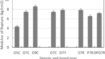 The boards obtained were conditioned for 1 week at 20 °C and 60 % relative humidity and then evaluated according to the Japanese Industrial Standard for particleboard (JIS A 5908, 2003) [16]. The static 3-point bending test was carried out on a 200 mm × 30 mm × 9 mm specimen from each board, and the effective span and loading speed were 150 mm and 10 mm/min, respectively. The modulus of rupture (MOR) and the modulus of elasticity (MOE) were calculated from the bending test. The internal bond strength (IB) test was performed on a 50 mm × 50 mm specimen with a loading speed of 2 mm/min, and thickness swelling (TS) after water immersion for 24 h at 20 °C was measured in specimens of the same size. Following the TS test, thickness changes and weight changes under a cyclic accelerated aging treatment (drying at 105 °C for 10 h, warm water immersion at 70 °C for 24 h, drying at 105 °C for 10 h, boiling water immersion for 4 h and drying at 105 °C for 10 h) were measured. Each experiment was performed five times, and the average values and standard deviations were calculated. Statistical significance was considered for p values <0.5.