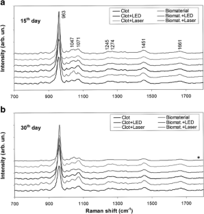 Pinheiro AL, Soares LG, Marques AM, Aciole JM, de Souza RA, Silveira L (2014) Raman ratios on the repair of grafted surgical bone defects irradiated or not with laser (λ780 nm) or LED (λ850 nm). J Photochem Photobiol B 138:146–154