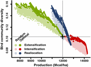Reconciling biodiversity conservation and food production may require the fine-tuning of both agricultural intensity and its spatial allocation. Here, we explored whether the optimization of allocation of intensity could improve food production and biodiversity outcomes. We developed a spatially explicit, multi-criteria optimization model for agricultural intensity allocation at the scale of France and at the resolution of small agricultural regions (SARs) with a mean area of 669.6 km2. Three thousand allocations were randomly simulated and then optimized under three scenarios: intensification, extensification, and reallocation. Optimization was based on food production and biodiversity outcomes using several metrics, such as habitat specialization and trophic level, that reflect the composition of farmland bird communities. The optimization was based on derived statistical relationships between intensity and the production and biodiversity metrics at the SAR scale using national agricultural statistics and bird census data. Simulations showed that optimal allocations modulated the trade-off among criteria and led to increased efficiency, with optimal extensification increasing biodiversity and minimizing production losses. Furthermore, we revealed “win-no loss” solutions. For example, optimal intensification increased production with almost no biodiversity loss and optimal reallocation benefited biodiversity with almost no cost to production. A variety of agricultural intensity levels were necessary to maintain a diversity of farmland bird communities at the national scale. Although we demonstrate that optimal allocation of intensity can be a powerful means of reconciling diverse criteria at the national scale, its implementation will require new mechanisms for spatially targeted and coordinated policies.