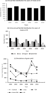 Integrated soil fertility management options are being promoted as ways of adapting agricultural systems to sustain yields on highly degraded and poor soils encountered throughout West Africa. The efficiency of these practices may be affected by high variability and uncertainty associated with seasonal rainfall, especially for areas such as Côte d’Ivoire, where intra-seasonal rainfall has been observed to change from 1 year to another. The DSSAT crop simulation model was used in this study as a tool to evaluate the impacts of soil improvement options including inorganic fertilizer and conservation agriculture generating higher carbon sequestration and crop yield in maize agro-ecosystems. The model was calibrated using agronomic data for three cropping seasons from 2009 to 2010 in Goulikao (Center-West Côte d’Ivoire) and Ahérémou 2 (Central Côte d’Ivoire), respectively and validated against independent datasets of yield of 2003–2004 seasons in the buffer zone of the Lamto Natural Reserve, Central Côte d’Ivoire. The model predicted average maize yields of 1454 kg ha−1 across the sites versus an observed average value of 1736 kg ha−1, R2 of 0.72, and RMSE of 597 kg ha−1 after the default values for stable soil organic matter fraction used in the model were substituted by the estimated one. For the validation, the predicted higher maize yield was consistently related to fallow biomass inputs and different rates of fertilizer, thus generating a RMSE of total aboveground biomass and grain yield of 606 kg ha−1 and 350 kg ha−1, respectively. The impact of fallow residues and cropping sequence on subsequent maize yield was simulated and compared with conventional fertilizer and control data using 12 years historic climate time series. We conclude that soil fertility improvements through conservation agriculture can sustain grain yield at the same level as conventional inputs of urea against larger climate variability. However, this system may be substituted by conventional agriculture when climate forecast reveals a dry cropping season year.