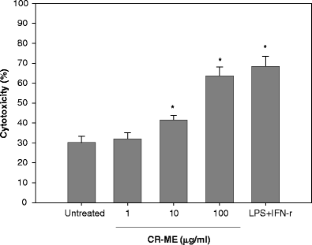 Lichen species were collected from King George Island (Antarctica) and were screened for their immunomodulatory effect. Among the lichens tested, the methanol extract (CR-ME) of Caloplaca regalis showed the highest nitric oxide (NO) production in murine peritoneal macrophages. Therefore, this study further examined the ability of C. regalis to induce secretory and cellular responses in macrophages. Macrophages were treated with various concentrations of CR-ME for 18 h. The CR-ME treatment induced tumoricidal activity and increased the production of tumor necrosis factor-α (TNF-α) and nitric oxide by macrophages. However, CR-ME had a little effect on the levels of reactive oxygen species, interleukin-1 and IFN-γ in CR-ME-treated macrophages. The CR-ME-induced tumoricidal activity was partially abrogated by a NO inhibitor and the anti-TNF-α antibody. Thus, the tumoricidal effect of CR-ME appeared to be mainly mediated by NO and TNF-α production from macrophages. Treating the macrophages with a p38 mitogen-activated protein kinase (MAPK) inhibitor partially blocked the tumoricidal activation induced by CR-ME, whereas inhibitors of the other kinases did not have an inhibitory effect. These results suggest that CR-ME induces the tumoricidal activity via the p38 MAPK-dependent pathway. Furthermore, electrophoretic mobility shift assay analyses revealed that the CR-ME treatment induced the activation of the NF-κB transcription factor. Overall, these results indicate that the tumoricidal activity induced by CR-ME is mainly due to TNF-α and NO production, and the activation of macrophage by CR-ME is mediated probably via the p38 MAPK and NF-κB pathway. Our results may also provide some leads in the development of new immunomodulating drugs.
