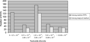 In a panel of seven genotypes, 437 expressed sequence tag (EST)-derived DNA fragments were sequenced. Single nucleotide polymorphisms (SNPs) that were polymorphic between the parents of three mapping populations were mapped by heteroduplex analysis and a genome-wide consensus map comprising 216 EST-derived SNPs and 4 InDel (insertion/deletion) markers was constructed. The average frequency of SNPs amounted to 1/130 bp and 1/107.8 bp for a set of randomly selected and a set of mapped ESTs, respectively. The calculated nucleotide diversities (π) ranged from 0 to 40.0 × 10−3 (average 3.1 × 10−3) and 0.52 × 10−3 to 39.51 × 10–3 (average 4.37 × 10−3) for random and mapped ESTs, respectively. The polymorphism information content value for mapped SNPs ranged from 0.24 to 0.50 with an average of 0.34. As expected, combination of SNPs present in an amplicon (haplotype) exhibited a higher information content ranging from 0.24 to 0.85 with an average of 0.50. Cleaved amplified polymorphic sequence assays (including InDels) were designed for a total of 87 (39.5%) SNP markers. The high abundance of SNPs in the barley genome provides avenues for the systematic development of saturated genetic maps and their integration with physical maps.