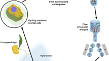 Only a decade after the first reports in Chinese hamster and human, de Laat and Blaas (1984) reported on flow karyotyping in a plant, Haplopappus gracilis, and sorting its two chromosome types. The progress in plants was slow due to a low degree of metaphase synchrony and difficulties with chromosome release from cells with rigid walls (for a review, see Doležel et al. (1994)). Initially, chromosome samples were prepared from suspension cultured cells (de Laat and Blaas 1984; Arumuganathan et al. 1991; Wang et al. 1992). This approach has been abandoned as the cultures are often heterogeneous and difficult to synchronize (Arumuganathan et al. 1991), karyologically unstable (Leitch et al. 1993; Schwarzacher et al. 1997), and not easy to initiate in some species. Conia et al. (1987, 1989) suggested using leaf mesophyll protoplast cultures as an alternative. But as mitotic synchrony induced by transferring isolated protoplasts to nutrient medium was rather low, and as protoplast cultures are hard to establish in many plants, the system has not been adopted by others. Currently the only method used widely describes the preparation of chromosome samples from root tip meristems of young seedlings (Doležel et al. 1992). The meristems are karyologically stable and their cells are easy to synchronize. Some authors used genetically transformed “hairy” root cultures when working with lines that cannot be maintained by seed propagation (Veuskens et al. 1995; Neumann et al. 1998).