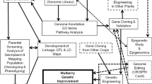 Total RNA was isolated from mulberry roots, barks, leaves, male flowers, female flowers, and fruits using RNAiso Plus (Takara, Japan) according to the manufacturer’s instructions. The quality and concentration of RNA samples were measured using a ND-1000 UV spectrophometer (Nanodrop Technologies, USA). Reverse transcription was performed following the manufacturer’s instructions (Takara, Japan). Primers were designed using Primer Premier 5 software (http://www.primer-e.com/). Polymerase chain reactions were performed in a 96-well plate with a StepOne Plus System apparatus, amplified with SYBR® Green II (Takara, Japan) according to the manufacturer’s instructions. Cycling conditions were as follows: 90 °C for 30 s; 40 cycles of 95 °C for 5 s and 60 °C for 30 s. Amplification specificity was verified by a dissociation curve. To compare data from different PCR runs, cycle threshold (C T) values for samples were normalized to that of the mulberry ribosomal protein gene (Morus024083). The cDNA quantity was calculated using \( {2}^{-\varDelta {C}_{\mathrm{T}}} \); here, ΔC T is the difference in the number of cycles between tests and controls. The change in gene expression after flooding treatment was measured using \( {2}^{-\varDelta \varDelta {C}_{\mathrm{T}}} \), where ΔΔC T = (ΔC T sample − ΔC T control). Gene-specific primers used for the real-time RT-PCR are listed in Supplementary Table 2. All results are representative of three independent experiments.