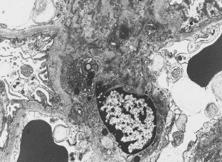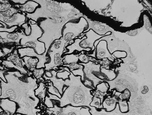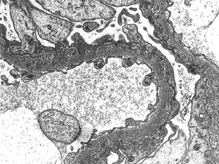 We describe a 24-year-old woman with a distinctive glomerular lesion. She presented with nephrotic syndrome and the diagnosis of systemic lupus erythematosus was made on the basis of laboratory and clinical findings. Renal biopsy showed a bubbling appearance of the glomerular capillary wall indicating lupus nephritis class V. On an electron microscopy, the glomerular basement membrane (GBM) was irregularly thickened and contained abundant vesicular and microtubular bodies. In addition, there were many epithelial foot processes infolding into the GBM. A few small deposits were observed beneath the foot processes and around the vesicular and microtubular bodies. Although the clinicopathological significance of podocytic infolding has not been fully elucidated, it may be a novel morphological entity in the glomerulonephritides.